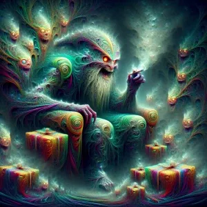 «In a hazy, psychedelic forest, a sinister Santa figure sits atop...»