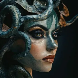 «Hollywood make-up, a woman painted to look Medusa, mysterious...»