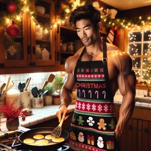 «A muscular man stands in a warmly decorated kitchen, radiating a...»