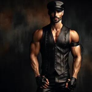«A muscular man stands confidently against a textured dark backdr...»