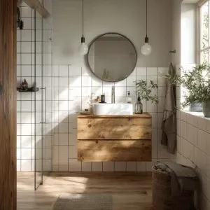 «Create an image of a compact Nordic bathroom featuring a pine wo...»