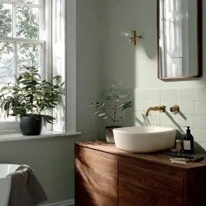 «Create an image of a small bathroom featuring sage green walls,...»