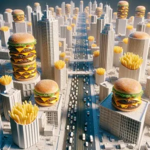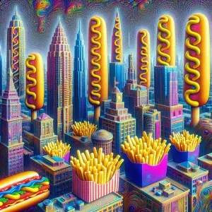 «A city made from cheeseburgers and french fries 3D 8K UHD halluc...»