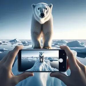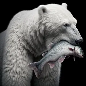 «Polar bear with a fish in its mouth, facing the camera,superreal...»