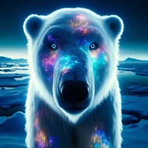 «Neon white polar bear with galaxycolor eyes, facing the camera,s...»
