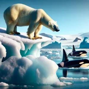 «Polar bear on a ice cap looking at the orcas in the ocean, Nati...»