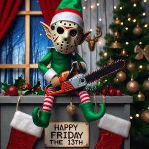 «Elf on the shelf wearing a hockey mask and holding a chainsaw dr...»