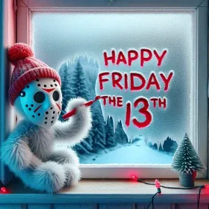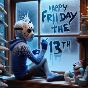 «Jack Frost wearing a hockey mask writing 'Happy Friday the 13th'...»