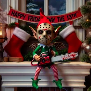 «An elf on the shelf donned in a hockey mask, gripping a blood-dr...»