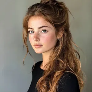 «a woman, look to the camera, half ponytail straight hairstyle»