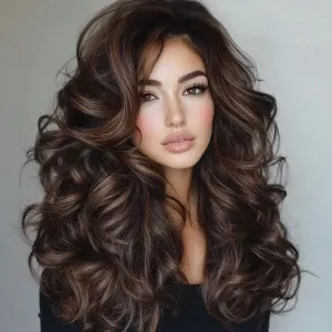 «a woman, look to the camera, Long Voluminous Curls Hairstyle, Bi...»