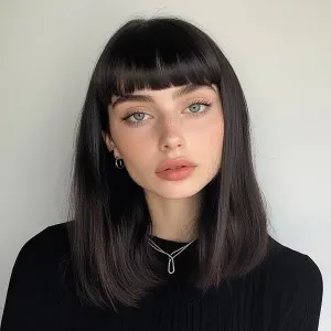 «a woman, look to the camera, Straight bangs Hairstyle, Blunt, fo...»