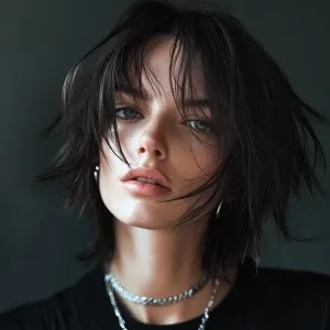 «a woman, look to the camera, close up photo, Shaggy cut Hairstyl...»