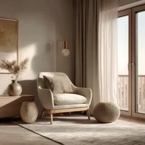 «Create a Scandinavian living room featuring oak wood furniture,...»