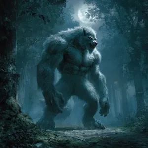 «In a moonlit forest clearing, visualize a powerful lycanthrope w...»