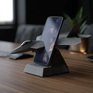 «3d of a F22 desk phone holder to hold a cell phone, F22 pointing...»
