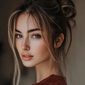«a woman, look to the camera, close up photo, Low Bun Hairstyle,...»