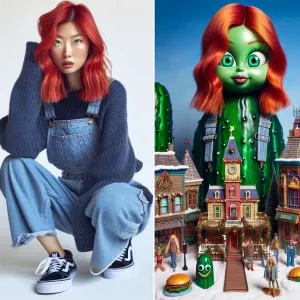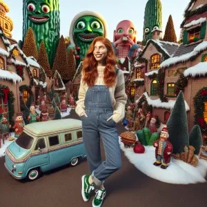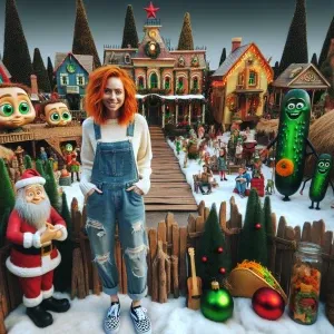 «Whimsical Christmas scene A woman with shoulder-length, vibrant...»