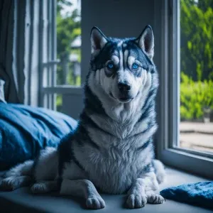 «Please generate an image of a fluffy gray husky with bright blue...»