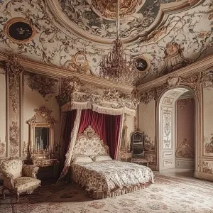 «photo of a baroque palace bedroom with canopy bed, baroque class...»