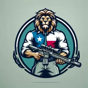 «muscular tactical wolf with texas flag shirt shooting a rifle»