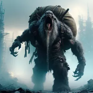 «Krampus stealing children in a sci fi post apocalypse world. He...»