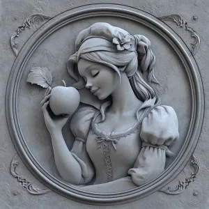 «Evil Snow white holding an Apple, grayscale 3d bas relief, round...»