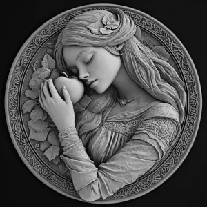 «Evil Sleeping Beauty holding an Apple, grayscale 3d bas relief,...»