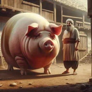 «An old farm, heavy farmer stsnding next to a gigantic fat pig»