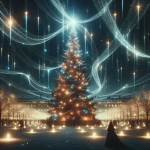 «A magnificent Christmas tree surrounded by Christmas magic light...»