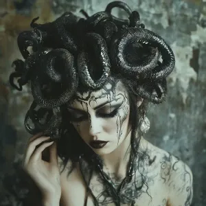 «Hollywood make-up, a woman painted to look Medusa, mysterious...»