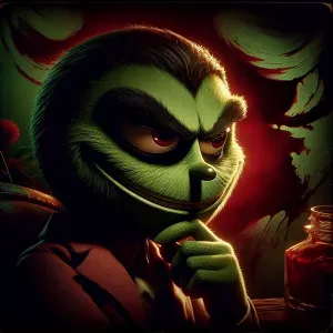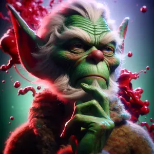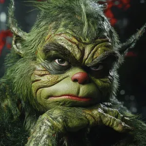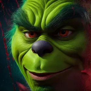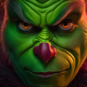 «A close-up photo of The Grinch's face, rendered in a surrealisti...»
