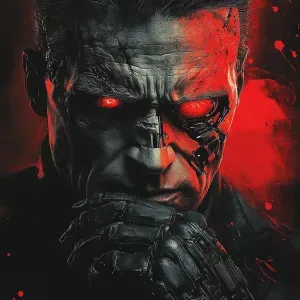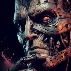 «A close-up photo of The T-800's face, rendered in a surrealistic...»