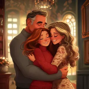 «A heartwarming and highly detailed scene of 3 people hugging, a...»