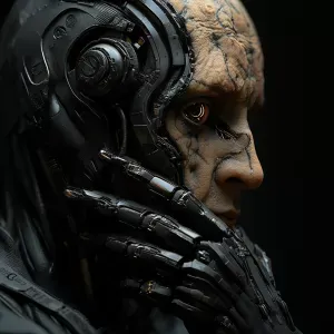 «A close-up photo of a cyborg's face, rendered in a surrealistic...»