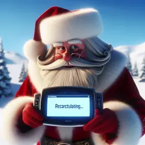 «Santa Claus looking confused, holding a GPS that says "Recalcula...»