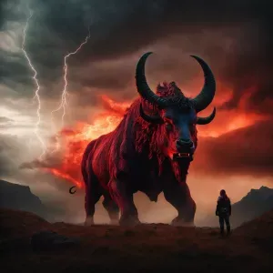 «Depict a colossal, minotaur-like mythical beast standing promine...»