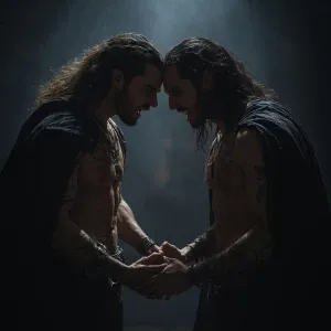 «The image depicts a close-up portrait of a shirtless male figure...»