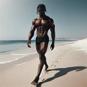 «Create an image of a well-muscled man with deep chocolate skin a...»