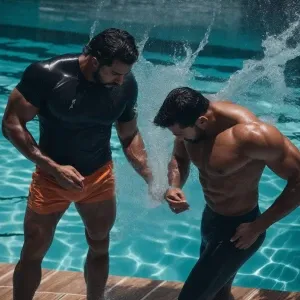 «Two muscular African American men sharing a gentle kiss, exuding...»