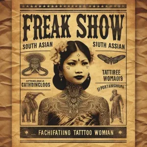 «Create a vintage-style Freak Show poster featuring tattoo woman,...»