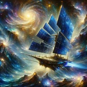 «In the midst of swirling galaxies, a solarpunk augmented cosmic...»