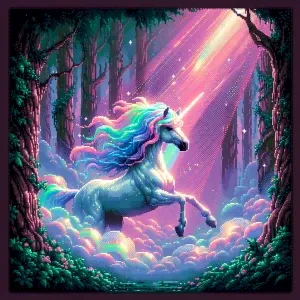 «A ethereal, shimmering unicorn emerges from a misty forest clear...»