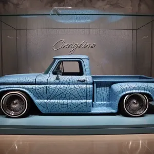 «Envision a lowrider truck crafted from cracked porcelain, cornfl...»