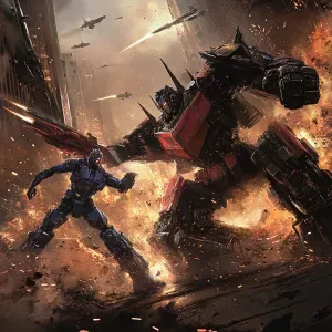 «Megatron locked in battle with Optimus Prime in a desolate citys...»