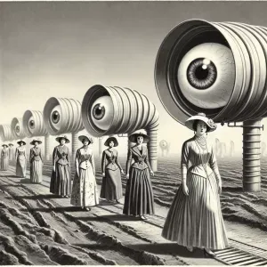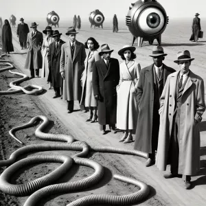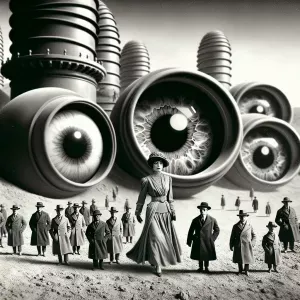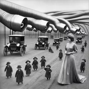 «Create a monochromatic, early 20th-century science fiction scene...»