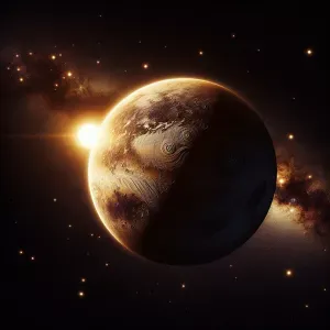 «A mystical rendering of a planet with the sun shining on it in t...»