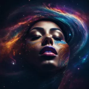 «Design a surreal cosmic artwork featuring a human face transform...»