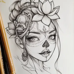 «A drawing of a neo traditional girl head half the face is a skul...»