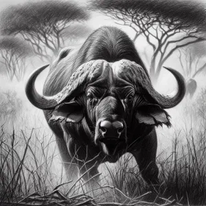 «charcoal sketch of a Cape buffalo standing in front of an Africa...»